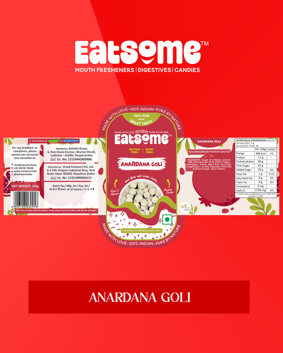 Take a trip down memory lane with EATSOME’s ANARDANA GOLI – the perfect childhood blend of tangy (khatta) and sweet (mitha). These traditional digestive candies are a flavor-packed treat made with a mix of unique ingredients. The sweetness of Sugar, Dry Mango, Pomegranate Seed, Cumin, and Black Salt dance together, while a dash of Black Pepper, Red Chilli, Pepper Long, and Dry Ginger adds just the right amount of spice. What makes this treat even more special is the delightful combo of Neembusat and Gulkand, giving you the ultimate balance of sour and sweet. Perfect as a post-meal digestive or a quick pick-me-up during the day, these little candies are sure to take your taste buds on a flavorful journey. We bet you won’t be able to resist the sweet tanginess of ANARDANA GOLI!